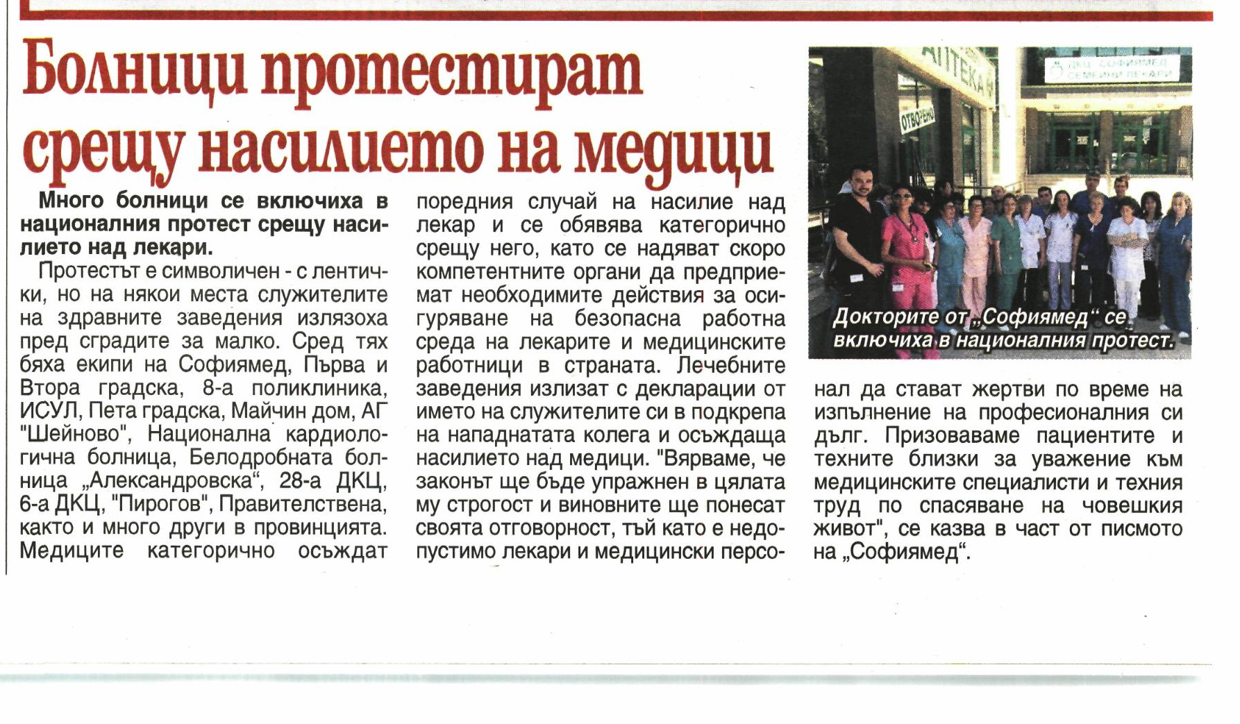 Протестът е символичен - с лентички, но на някои места служителите на здравните заведения излязоха пред сградите за малко. Сред тях бяха екипи на Софиямед, Първа и Втора градска, 8-а поликлиника, ИСУЛ, Пета градска, Майчин дом, АГ "Шейново", Национална кардиологична болница, Белодробната болница "Александровска", 28-а ДКЦ, 6-а ДКЦ, "Пирогов", Правителствена, както и много други в провинцията. Медиците категорично осъждат поредния случаи на насилие над лекар и се обявява категорично срещу него, като се надяват скоро компетентните органи да предприемат необходимите действия за осигуряване на безопасна работна среда на лекарите и медицинските работници в страната. Лечебните заведения излизат с декларации от името на служителите си в подкрепа на нападнатата колега и осъждаща насилието над медици. "Вярваме, че законът ще бъде упражнен в цялата му строгост и виновните ще понесат своята отговорност, тъй като е недопустимо лекари и медицински персонал да стават жертви по време на изпълнение на професионалния си дълг. Призоваваме пациентите и техните близки за уважение към медицинските специалисти и техния труд по спасяване на човешкия живот", се казва в част от писмото на "Софиямед".