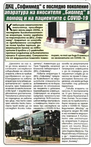 Комбиниран хематологичен анализатор, произведен през месец март 2020г., е последната високотехнологична апаратура, която заработи на територията на ДКЦ "Софиямед". Апаратът се използва за едновременно изследване на пълна кръвна картина, диференциално броене на левкоцитите в кръвта и С-реактивен протеин (индикатор за възпалителни процеси в организма). Специалистите от медицинския комплекс коментират, че той ще бъде в помощ