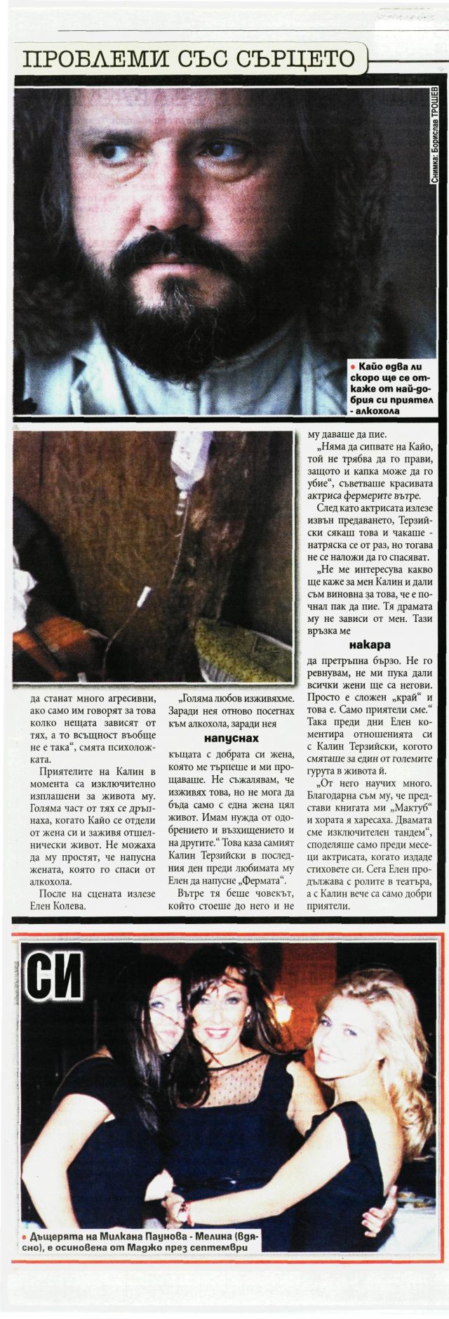 Калин Терзийски в болница в. България днес Стр. 1, 4, 5 1.11.2016 Психиатърът писател Калин Терзийски бе приет по спешност в УМБАЛ "Софиямед" със съмнение за прединфаркт, научи "България Днес". Авторът на "Сол" "пресоли" манджата, като изпадна в паникатака, която извади извън ритъм сърцето му, и докторите се намесиха, за да го спасят. Писателят е постъпил в клиниката по кардиология, където специалистите му сложили холтер, който проследил състоянието на сърцето му за 24 часа. То установило ритъмно нарушение, но предизвикано от състояние на силен стрес. "Продължавам напред, добре съм. Смятам, че ще се справя, и вече се върнах отново в предаването", обяснил Терзийски, като по този начин успокоил всичките си близки, неинформирани за здравето му. Очаква се тези дни Кайо да съобщи решението си дали ще продължи в играта, но най-вероятно ще рискува. "Той не е толкова слаб, колкото изглежда. Беше пръв във всички най-трудни игри и най-гадна работа - копаеше, сглоби външна тоалетна, чистеше на животните без мрънкане. Няма да се откаже, освен ако тялото му не го предаде", сподели за избора на Калин дали да остане в играта колегата му, отпаднал от вчерашния двубой Тодор. На два пъти състоянието на Терзийски се влошавало, като първия път пак имал ритъмни нарушения, но бързо влязъл във форма и само участниците в риалитито разбрали, че не се чувства добре. Тогава доктор не бил викан. Следващият път, когато се наложи да се вика линейка заради психиатъра писател, бе провокиран от факта, че той пресуши две бутилки вино за отрицателно време. Като бивш алкохолик, неблизвал повече от три месеца спиртна напитка, Терзийски не издържа и за малко да получи хипогликемия. Включените системи на леглото му във фермата подобриха положението му. Докторите продължават да се съмняват, че колегата им ще издържи до края на предаването предвид тежките физически усилия, които се полагат при седмичните двубои за оставане в играта. "Той няма забрана да се състезава, няма опасна игра за него, освен ако не се включи употребата на алкохол. Това може да е застрашаващо за пациента ни", обясниха от кардиологията на болницата. Самият Калин вече се върна във "Фермата", изрисува обора и видимо се чувства добре. "Той няма как да се откаже от алкохола завинаги. Вече го е правил и не е успял. Сам човек трудно може да излезе от тази Зависимост Ще трябва и да му се помогне", смята психоложката на предаването Ани Владимирова. Според нея в момента специалистите не смеят да дават съвети на Терзийски как да се справи с проблема си, защото самият той е завършил психиатрия. "Такъв тип хора могат да станат много агресивни, ако само им говорят за това колко нещата зависят от тях, а то всъщност въобще не е така", смята психоложката. Приятелите на Калин в момента са изключително изплашени за живота му. Голяма част от тях се дръпнаха, когато Кайо се отдели от жена си и заживя отшелнически живот. Не можаха да му простят, че напусна жената, която го спаси от алкохола. После на сцената излезе Елен Колева. "Голяма любов изживяхме. Заради нея отново посегнах към алкохола, заради нея напуснах къщата с добрата си жена, която ме търпеше и ми прощаваше. Не съжалявам, че изживях това, но не мога да бъда само с една жена цял живот. Имам нужда от одобрението и възхищението и на другите." Това каза самият Калин Терзийски в последния ден преди любимата