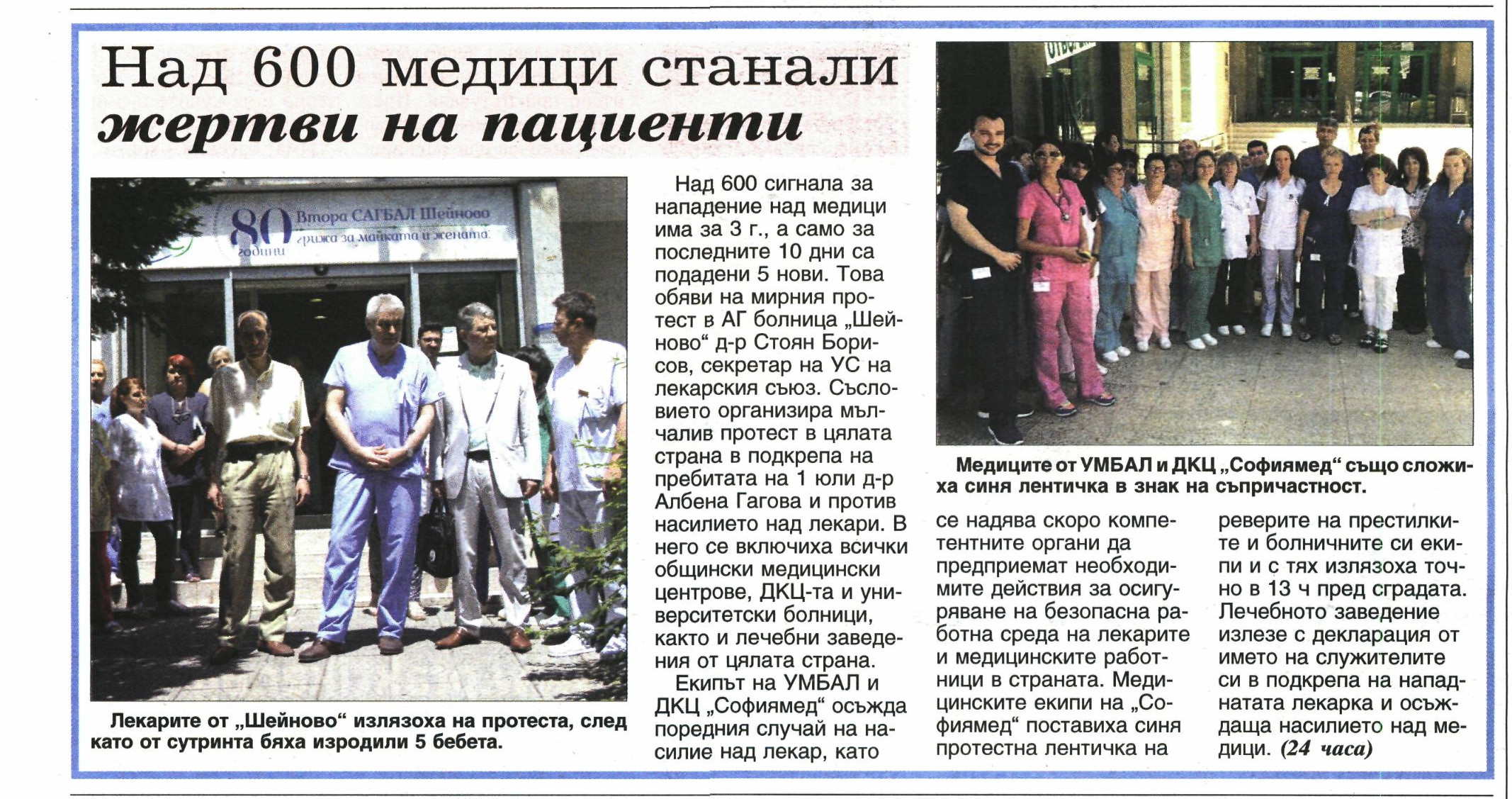 Над 600 сигнала за нападение над медици има за 3 г., а само за последните 10 дни са подадени 5 нови. Това обяви на мирния протест в АГ болница "Шейново" д-р Стоян Борисов, секретар на УС на лекарския съюз. Съсловието организира мълчалив протест в цялата страна в подкрепа на пребитата на 1 юли д-р Албена Гагова и против насилието над лекари. В него се включиха всички общински медицински центрове, ДКЦ-та и университетски болници, както и лечебни заведения от цялата страна.