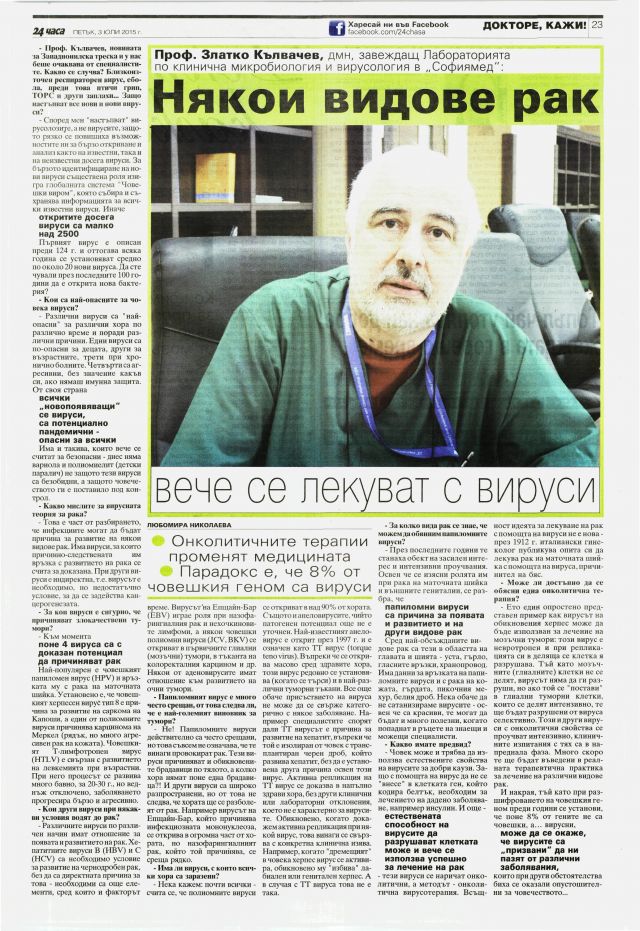 - Човек може и трябва да използва естествените свойства на вирусите за добри каузи. Защо с помощта на вирус да не се "внесе" в клетката ген, който кодира белтък, необходим за лечението на дадено заболяване, например инсулин. И още естествената способност на вирусите да разрушават клетката може и вече се използва успешно за лечение на рак - тези вируси се наричат онколитични, а методът - онколитична вирусотерапия. Всъщност идеята за лекуване на рак с помощта на вируси не е нова -през 1912 г. италиански гинеколог публикува опита си да лекува рак на маточната шийка с помощта на вируса, причинител на бяс.