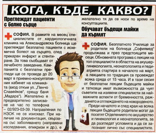 + СОфИЯ. Безплатното Училище за родители на болница "Софиямед" продължава и през предстоящите месеци. Обновената програма с лекции на топ специалисти в областта на акушергинекологията, неонатологията и педиатрията стартира в началото на март, а лекциите по традиция се провеждат всяка сряда от 15 часа. И в тази сесия от безплатни лекции бъдещите майки и татковци имат възможността да чуят съветите на изявени специалисти за най-важните аспекти от бременността, раждането и отглеждането на новороденото. Преди началото и след края на всяка лекция бъдещите родители могат да посетят Отделението по акушерство и гинекология и неонатологията, за да разгледат условията и да се запознаят лично със специалистите.