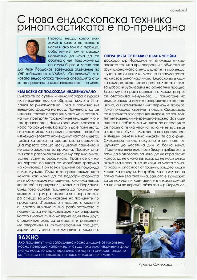Първото нещо, което виждаме в лицето на човек, е носът и ако той е с гърбица, собственикът му е съвсем нормално да иска да се сбогува с нея. Това може да се случи бързо и лесно при д-р Иван Йорданов, завеждаш, отделение по УНГ заболявания в УМБАЛ "Софиямед". А с новата ендоскопска техника операцията става по-прецизна и възстановяването - по-леко.