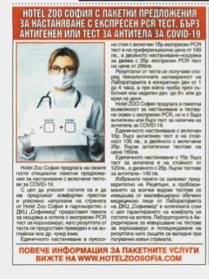 С цел да улеснят гостите си и да им предложат комфортен престои и улеснено напускане на страната от Hotel Zoo София в партньорство с ДКЦ "Софиямед" предоставят пакети за нощувка в хотела с експресен PCR тест за коронавирус, като резултата от теста се предоставя преведен и на английски или др. чужд език.