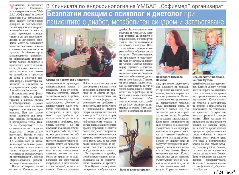 Уникална възможност предлага Клиниката по ендокринология на УМБАЛ „Софиямед“ за своите пациенти със заболявания като диабет, метаболитен синдром и затлъстяване. Всеки вторник и четвъртък лежащоболните и хората, които провеждат консултациите си при ендокринолозите в лечебното заведение могат да посещават напълно безплатно лекции с психолог и специалист по хранене. Рехабилитатор и кинезитерапевт разработва индивидуален тренировъчен режим, съобразен с проблема и целите на пациента. „Всичко това част от цялостна програма, която се разработва и предстои да влезе в действие съвсем скоро“, коментира началникът на Клиниката по ендокринология проф. д-р Анна-Мария Борисова.