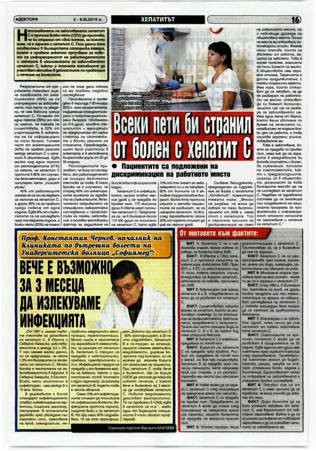 Само 10% от инфектираните стигат до клиниките по инфекциозни болести. Инфекцията протича скрито, същото важи и за хепатит В. Но при него 90% оздравяват, 10 на сто хронифицират. Докато при хепатит С - 80% хронифицират, а 20 на сто оздравяват. Хепатит В е по-труден за лечение, защото нямаме ефективни медикаменти, държим болестта под контрол, но не можем да махнем вируса от организма на пациента. При хепатит С това вече е възможно. Ще се борим НЗОК да започне да покрива новото лечение, с което вече е възможно за 3 месеца да излекуваме хепатит С. Новите медикаменти действат фантастично. Те са одобрени в САЩ едва в началото на т.г.", заяви един от водещите специалисти в тази област проф. Чернев.