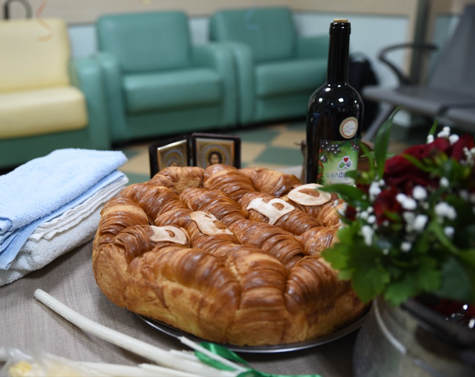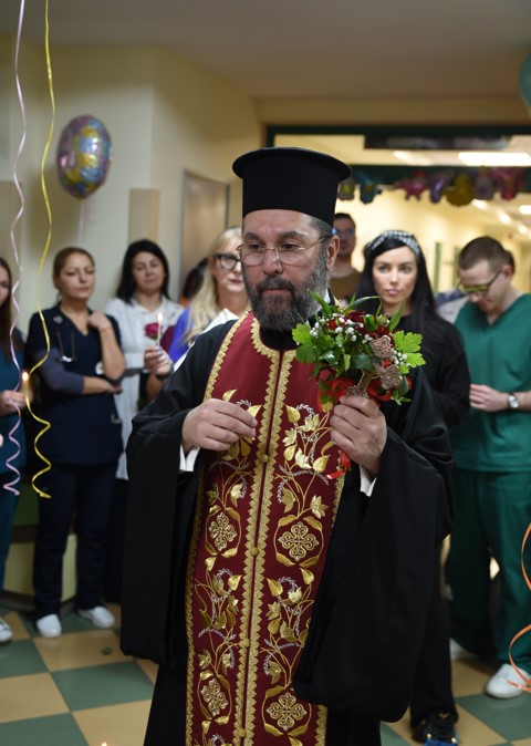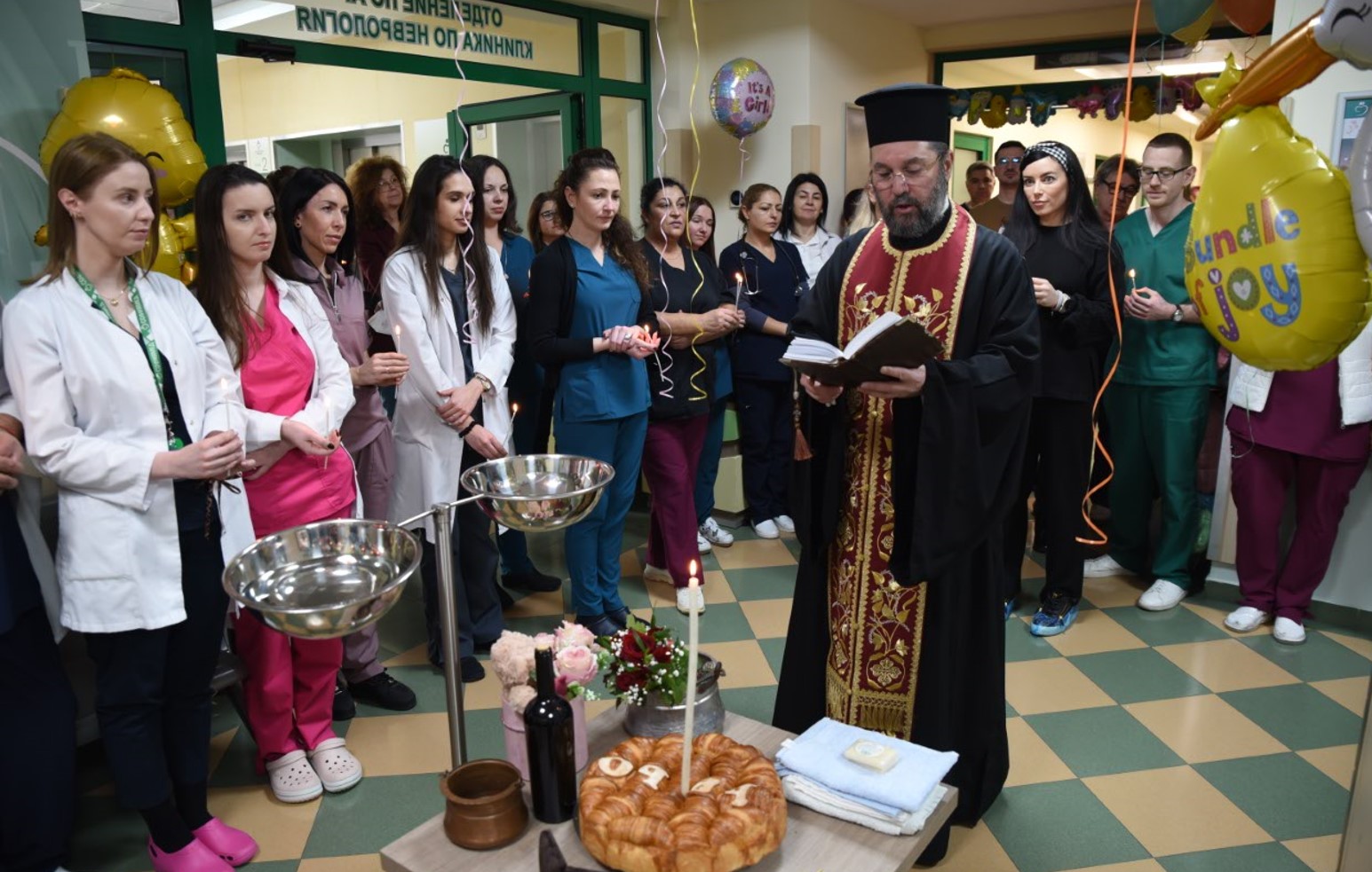 Денят продължи с благословия и молитва за здраве на всички присъстващи. Водата за традиоционния за празника ритуал „Поливане", при който се измиват първо ръцете на най-дълго практикувалия акушер-гинеколог и акушерка в знак на почит и уважение, бе осветена от отец Александър, в приствието на екипите на Отделенията по акушерство и гинекология, неонатология, ръководството на медицинския комплекс и специалиасти от други структури в болницата, които присъстваха на празника, за да уважат своите колеги.