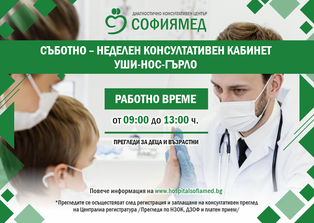 Поради зачестяването на острите хронични инфекции през пролетно-летния сезон специалистите от УМБАЛ „Софиямед“ разкриват консултативен УНГ кабинет, които ще работи на територията на ДКЦ „Софиямед“ и в съботните и неделни дни. Консултативните прегледи за деца и възрастни ще се извършват от 9:00 до 13:00ч.