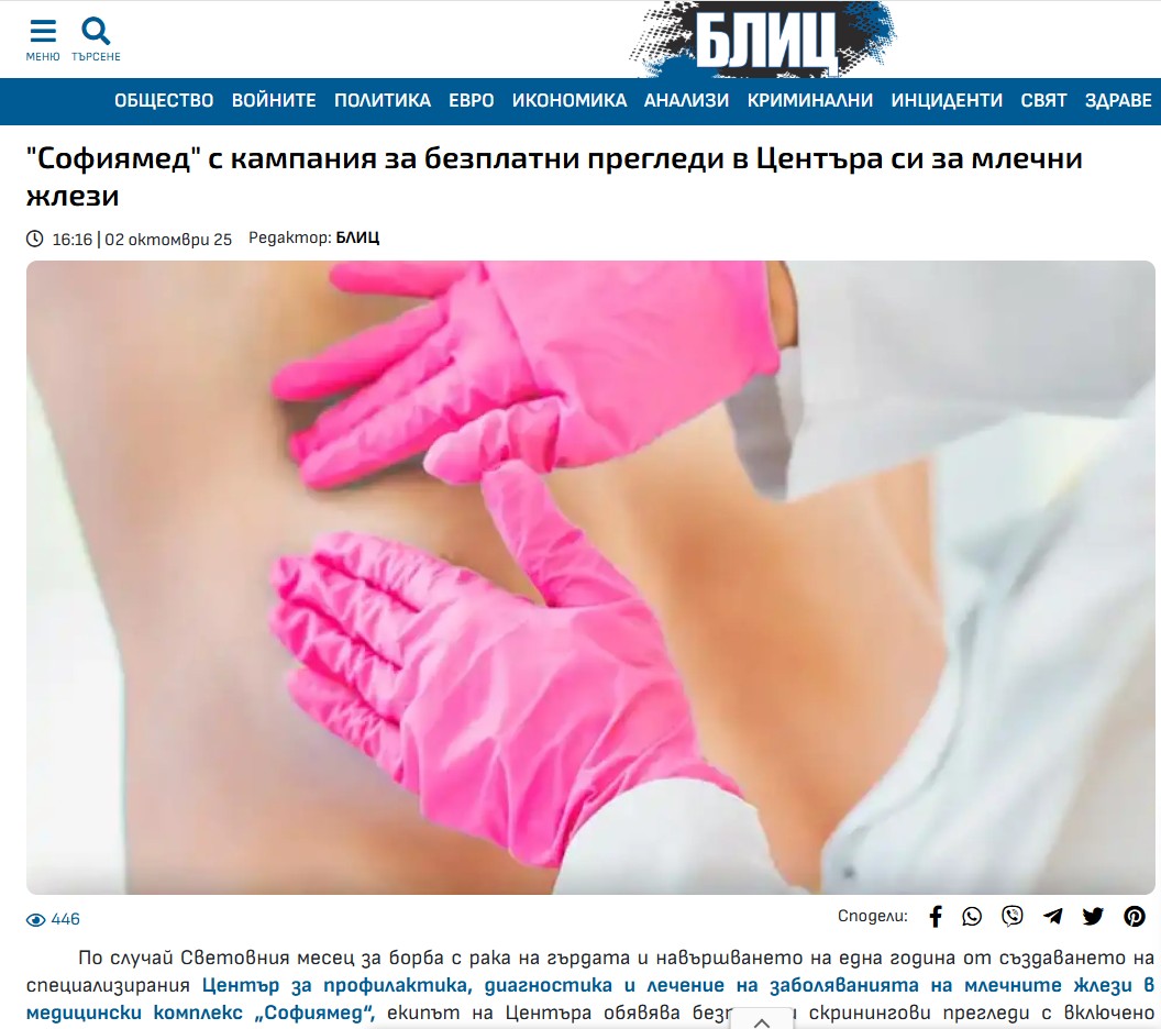 По случай Световния месец за борба с рака на гърдата и навършването на една година от създаването на специализирания Център за профилактика, диагностика и лечение на заболяванията на млечните жлези в медицински комплекс „Софиямед“, екипът на Центъра обявява безплатни скринингови прегледи с включено изследване чрез ехография на млечни жлези.