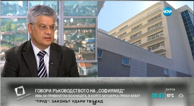 „Софиямед” не само не е привилегирована, а е ощетена". Това заяви за "Здравей,България" д-р Иван Колчаков - представител на ръководството на болницата, където 4-дневно бебе беше пребито от акушерка. "Нямаме получено уведомление за такива средства", изтъкна лекарят, като добави, че парите, които получават, са подплатени с много дейности и разкрити бази. "Тази година държавата реши да съкрати парите за здравеопазването и болниците. Средният процент на редукция за софийските болници е 94% от бюджета на всяка болница за миналата година. Бюджетът на "Софиямед" е на 93%", заяви д-р Колчаков. По думите му заплатите в болницата са едни от най-големите в брашна. По време на разговора беше излъчен репортаж на "Господари на ефира" от ноември на миналата година за неправилно написана епикриза, която събуди съмнения за източване на средства от Здравната каса. Тогава от ръководството увериха, че става дума за объркани документи и че нарушения не са били извършени