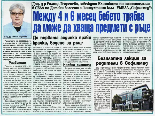 Завеждащата Клиниката по неонатология в СБАЛ по детски болести и консултант към АГ Клиниката на УМБАЛ "Софиямед" доц. д-р Ралица Георгиева коментира, че родителите трябва да бъдат запознати с основните етапи в двигателното и нервно-психичното развитие на кърмачето, така че сами активно да търсят помощ. Специалистът обръща внимание, че в периода до 3-месечна възраст детето трябва постепенно да придобие добър контрол на главата (през първия месец я повдига за кратко от положение по корем, но на 3 месеца я държи стабилно и има опора на предмишниците).